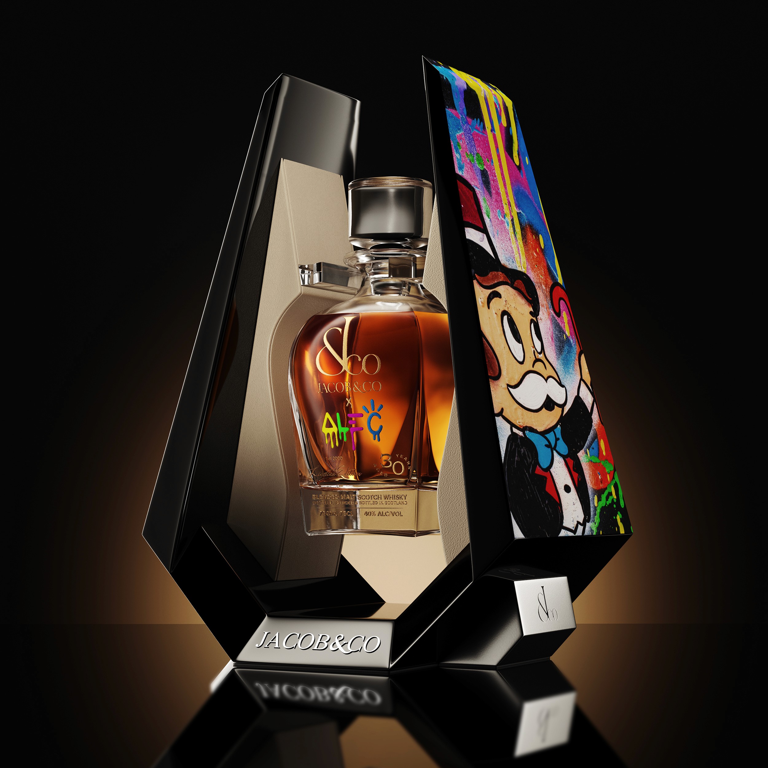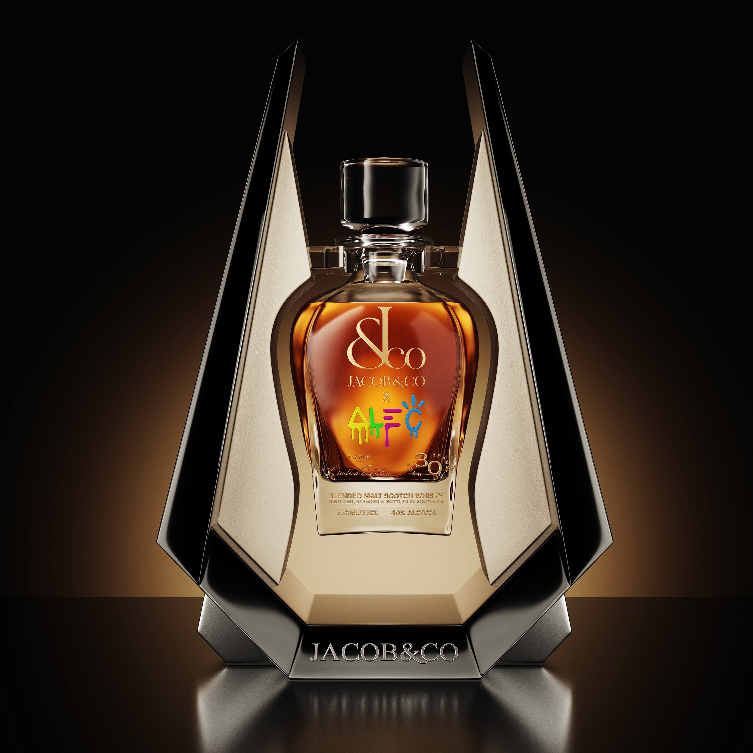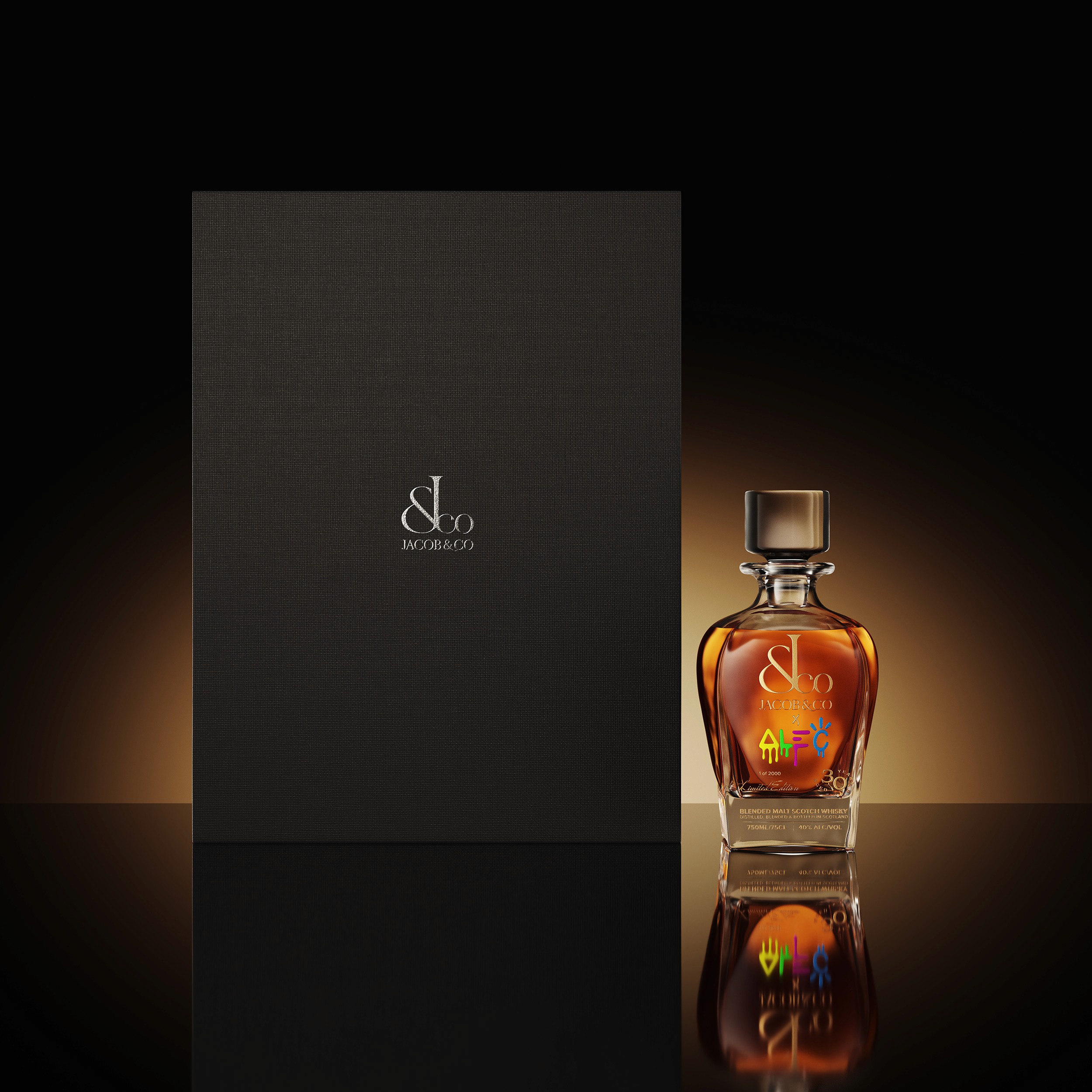 Jacob & Co. joins forces with Alec Monopoly and Master Blender, Andrew Rankin to introduce an exclusive 30-year-old whisky. The limited-production whisky’s inception was realized in 2016, when Andrew Rankin assembled a selection of fine Scotch whiskies aged in 1st and 2nd fill ex-Bourbon American Oak. The blend was then 26 years old and was immediately refilled in new American Oak bourbon barrels. It spent the last four years marrying and aging as one, making Jacob & Co. x Alec Monopoly Limited Edition Whisky a 30-year-old blend. Our team had the great opportunity to produce the visuals for this exclusive release - from the study of technical files, to 3D and realized high resolution visuals, which showcases the exquisite bottle design and unique casing and packaging in typical Jacob & Co fashion.