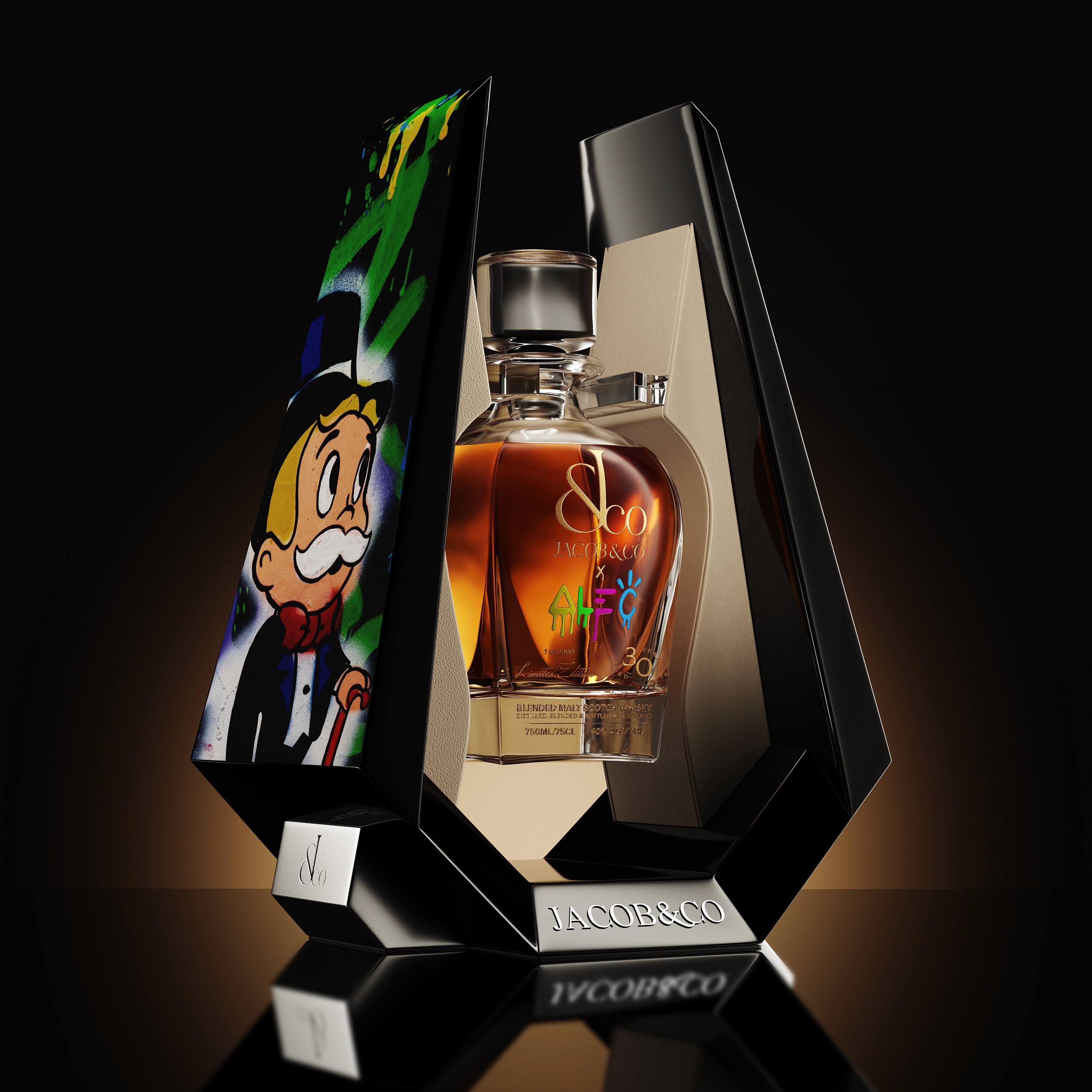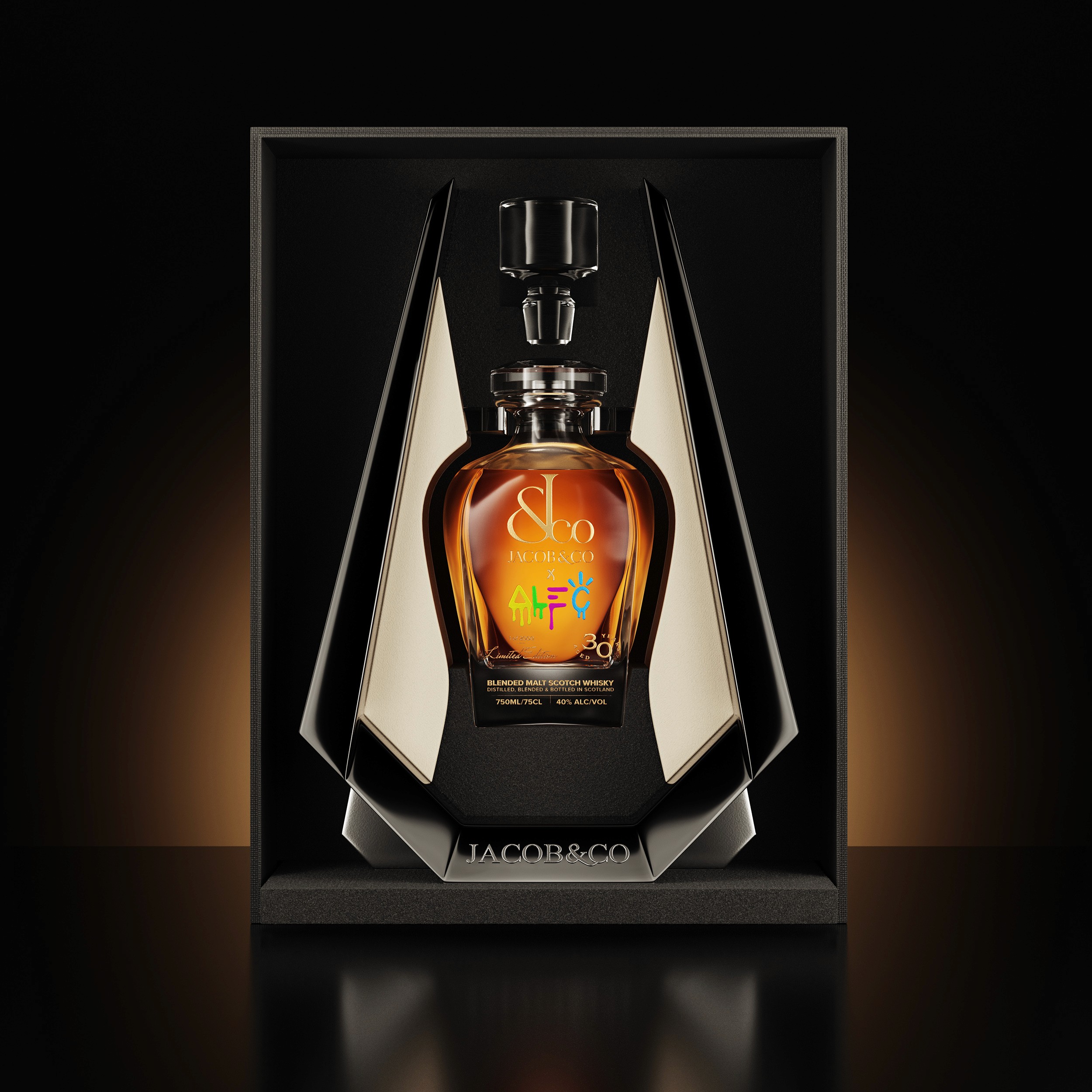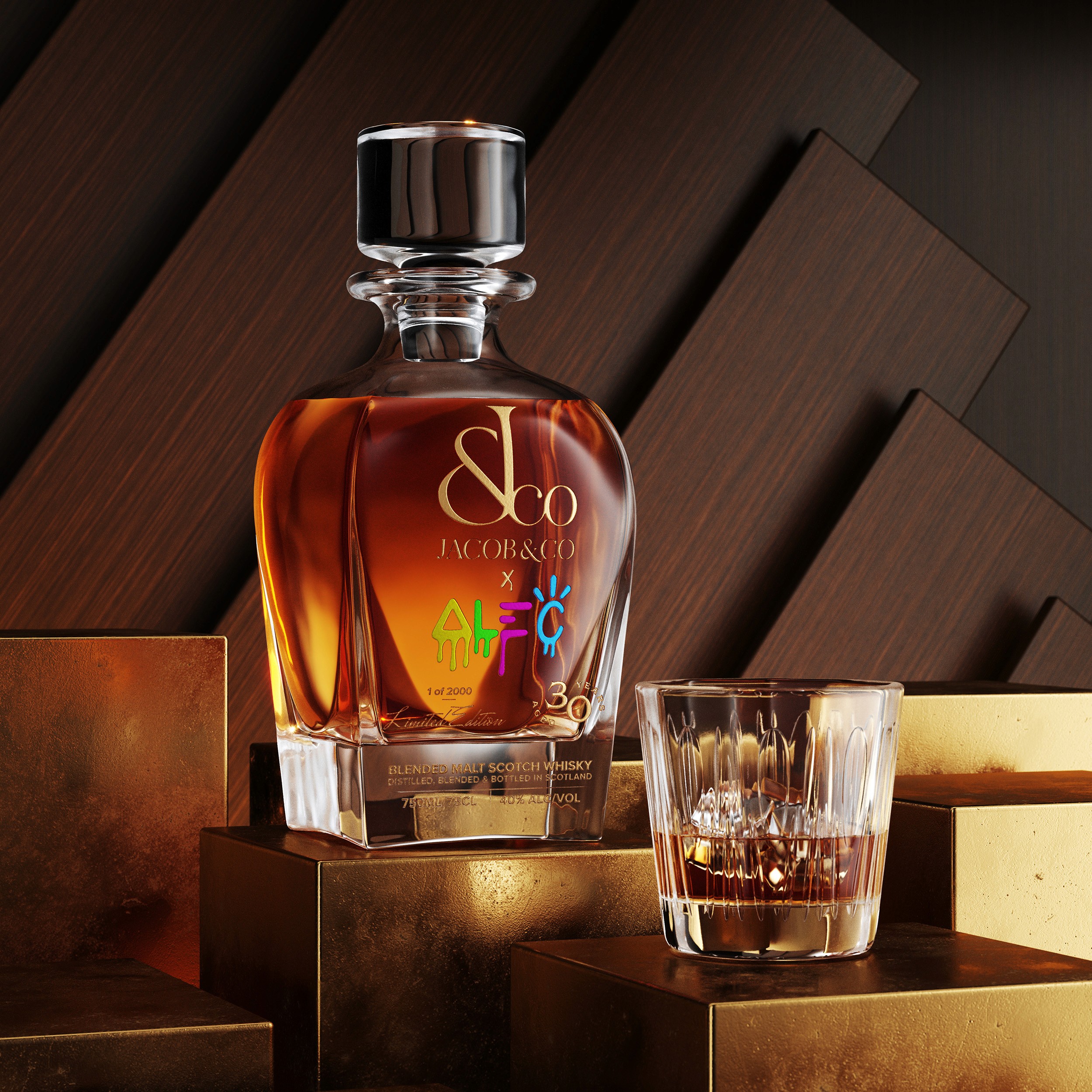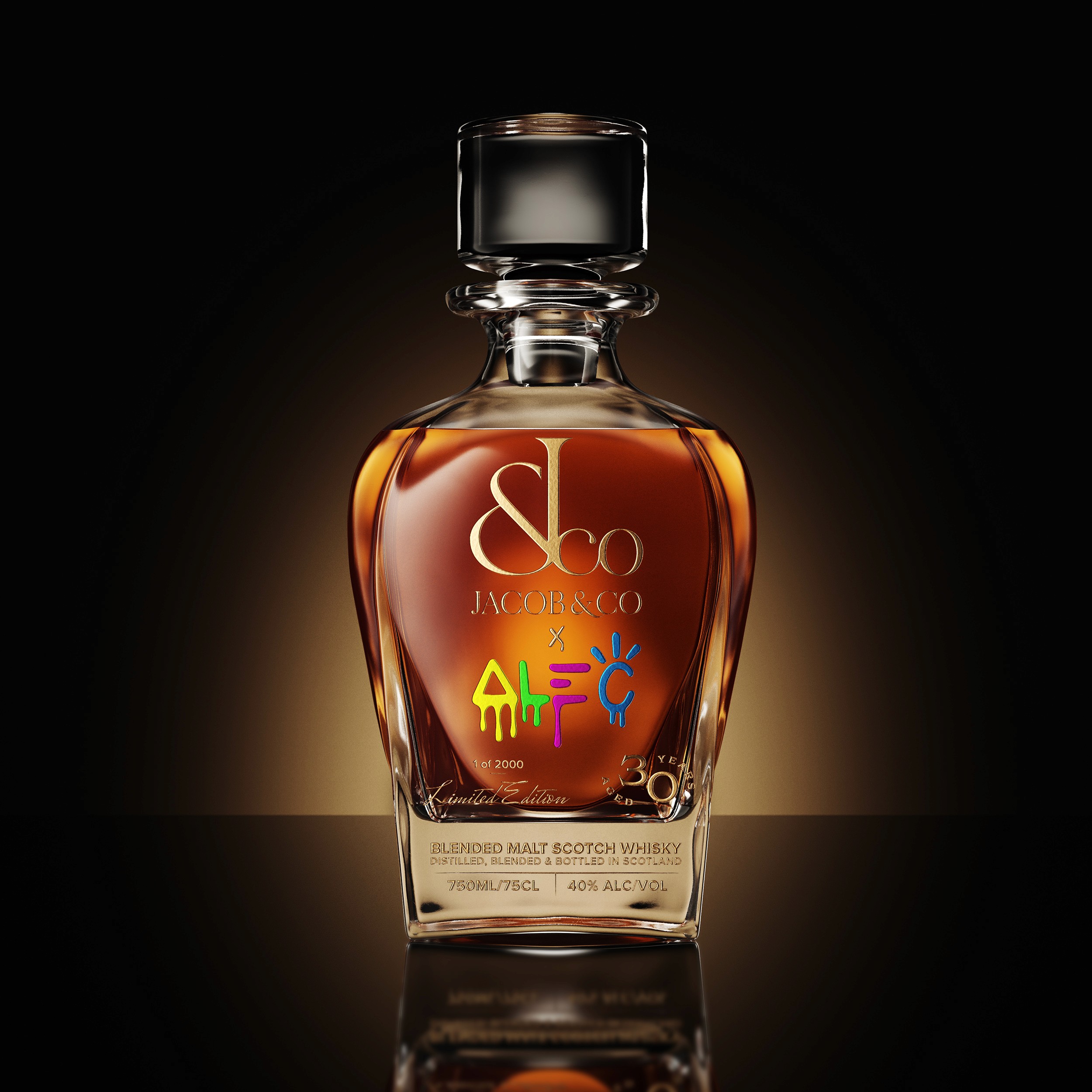 Jacob & Co. joins forces with Alec Monopoly and Master Blender, Andrew Rankin to introduce an exclusive 30-year-old whisky. The limited-production whisky’s inception was realized in 2016, when Andrew Rankin assembled a selection of fine Scotch whiskies aged in 1st and 2nd fill ex-Bourbon American Oak. The blend was then 26 years old and was immediately refilled in new American Oak bourbon barrels. It spent the last four years marrying and aging as one, making Jacob & Co. x Alec Monopoly Limited Edition Whisky a 30-year-old blend. Our team had the great opportunity to produce the visuals for this exclusive release - from the study of technical files, to 3D and realized high resolution visuals, which showcases the exquisite bottle design and unique casing and packaging in typical Jacob & Co fashion.