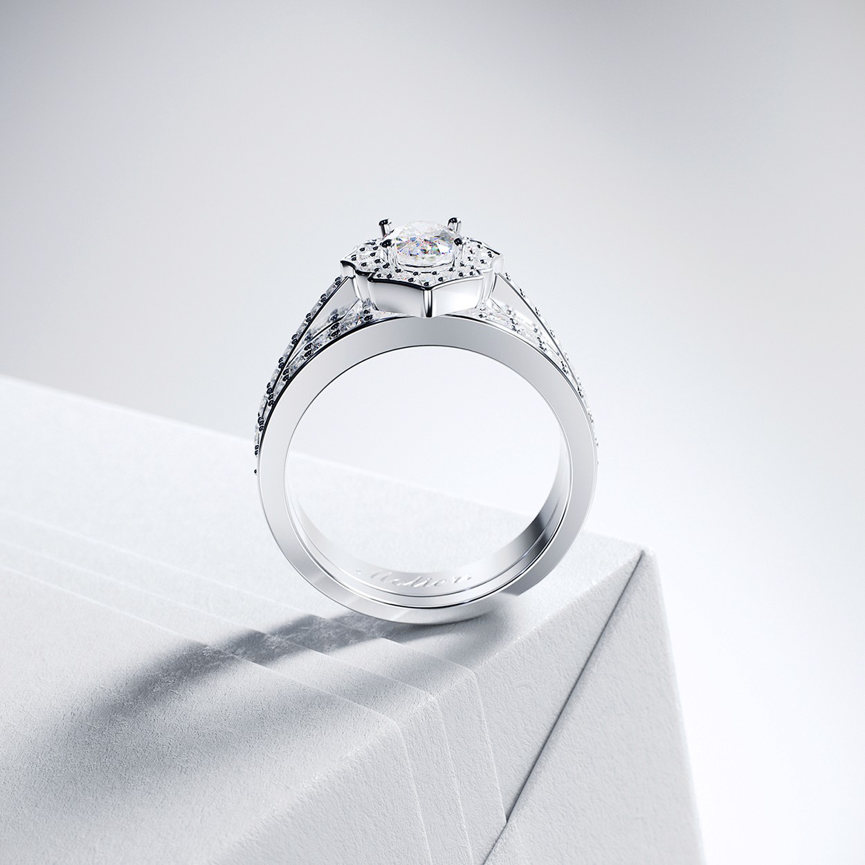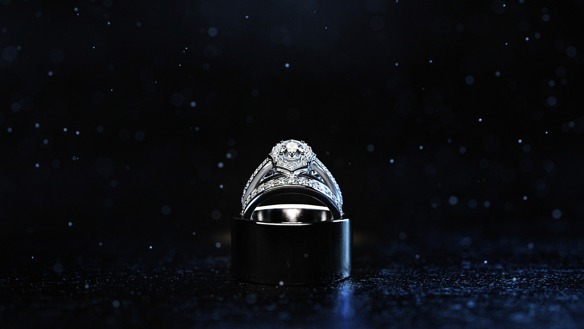 This sparkling 2 piece engagement ring features a round-cut prong-set diamond centerpiece with a total of 16 bright round-cut diamonds adding shimmer to the magnificent continuous loop-style band. Tasked to create cinematic scenes to showcase this beautiful custom set, we developed contrasting environments as a perfect symbol of everlasting love between two worlds.