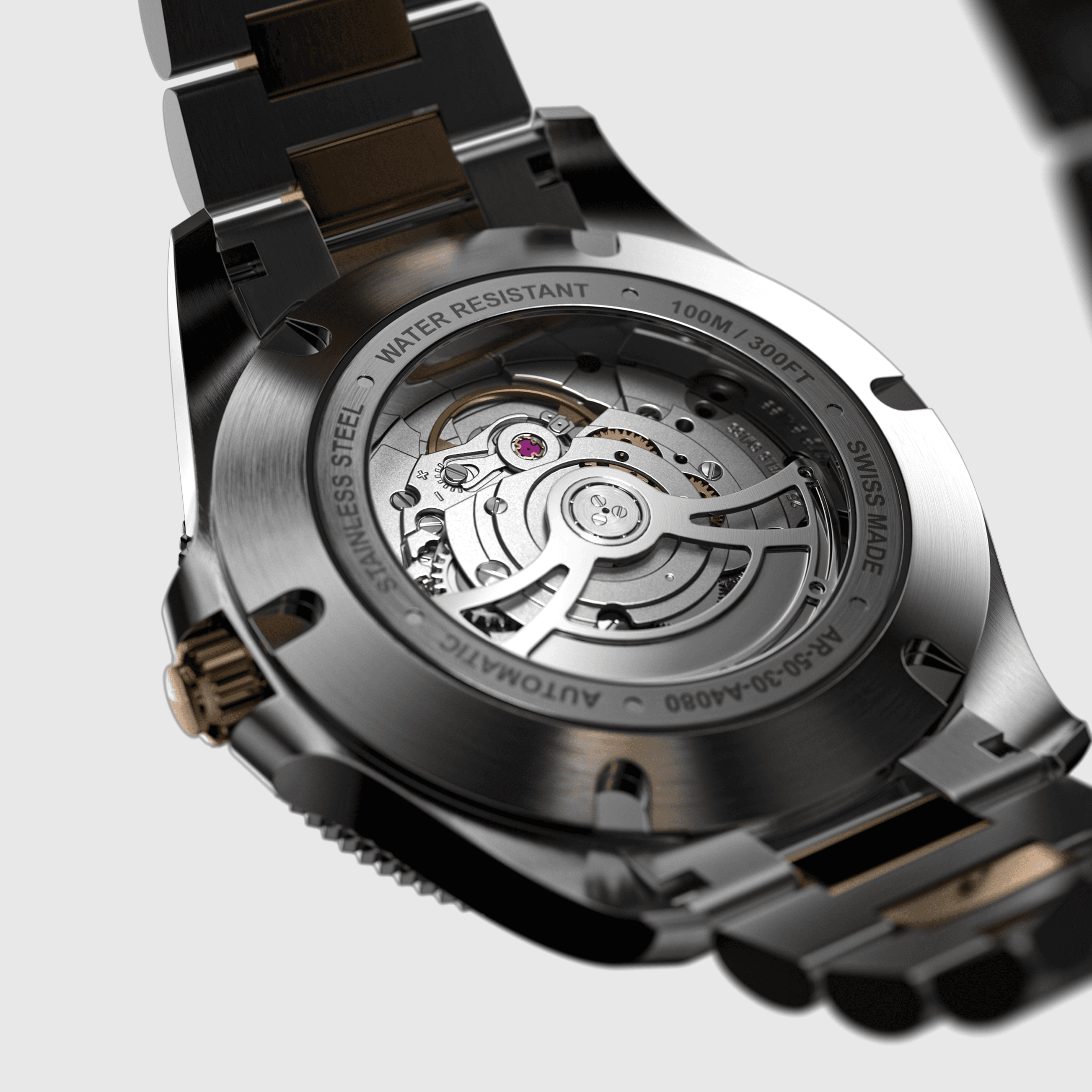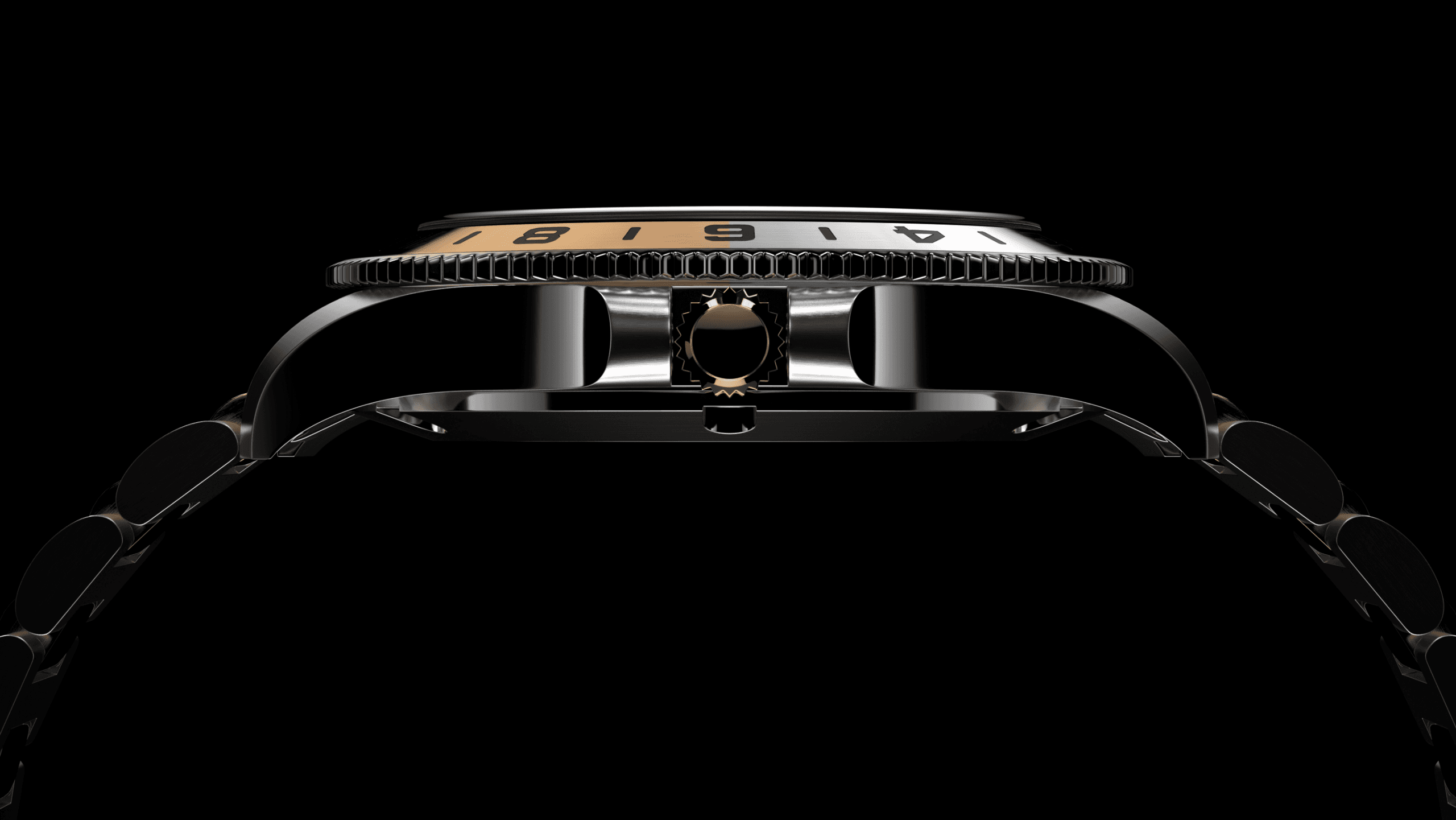 From mechanical specifications, we developed a detailed 3D drawing of the watch's case, ratcheting bezel, dial and integrated steel bracelet. We also studied the spec reports for the Swiss ETA 2824 calibre, and developed a detailed 3D model for the exhibition case back. With the completed CAD data, we developed a 5 sec teaser animation, to introduce the collection to the market and an array of CGI Static renderings for marketing. These shots included, front profile shots, in 3 SKUs, a side profile shot, done in a teaser format, a titled front view hero shot and a shot of the case back revealing the exposed calibre. This pilot watch pays homage to the pioneers of flight. Utilising the flagship 2 tone steel and gold SKU, these pieces aim to captivate luxury.